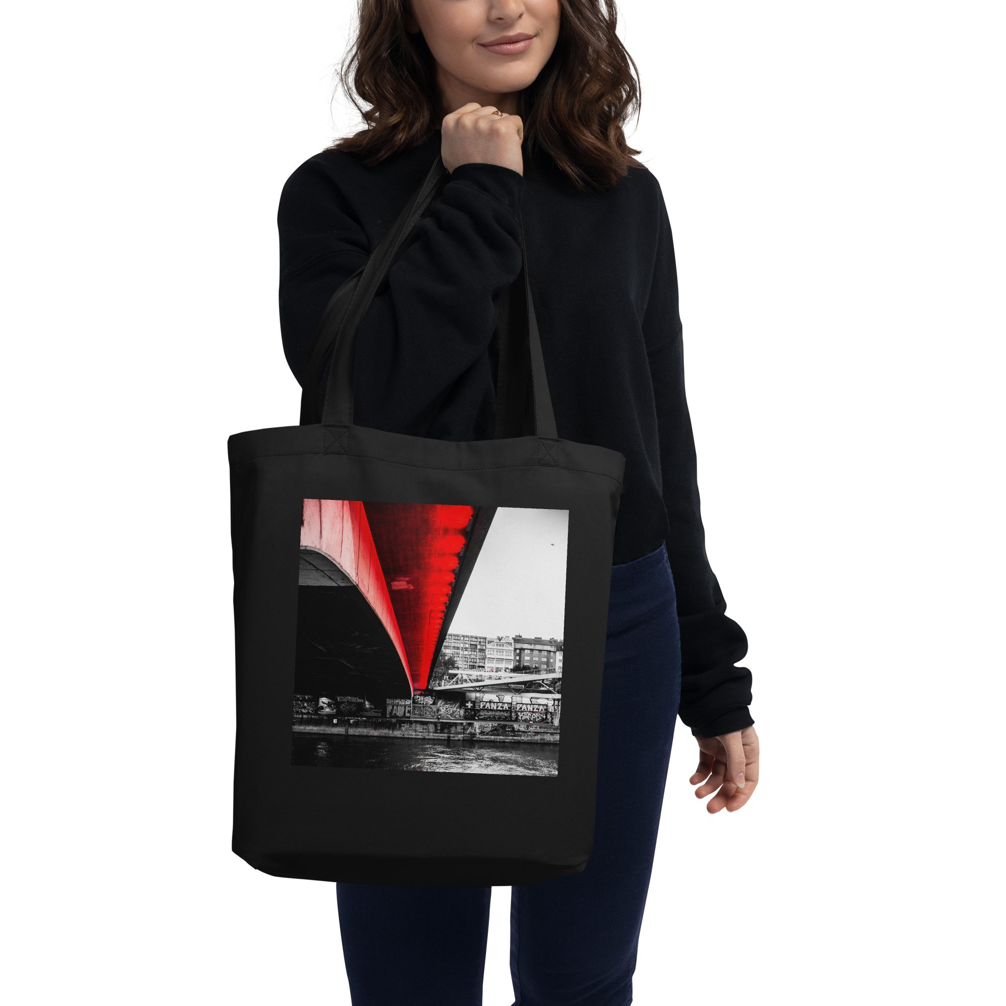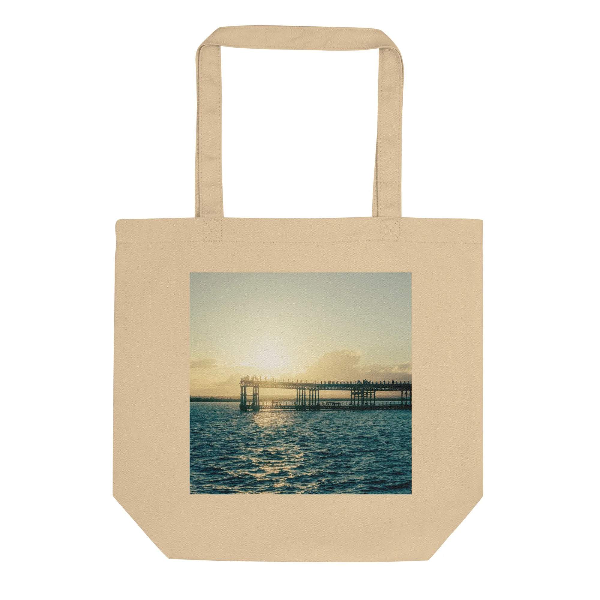 Trade plastic for cinematic art. The "OnuBag" features our iconic study of industrial geometry meeting the warmth of the sunset. This detailed perspective of a maritime pier silhouetted against a brilliant sky transforms a sustainable essential into a statement of structural beauty and minimalist style.